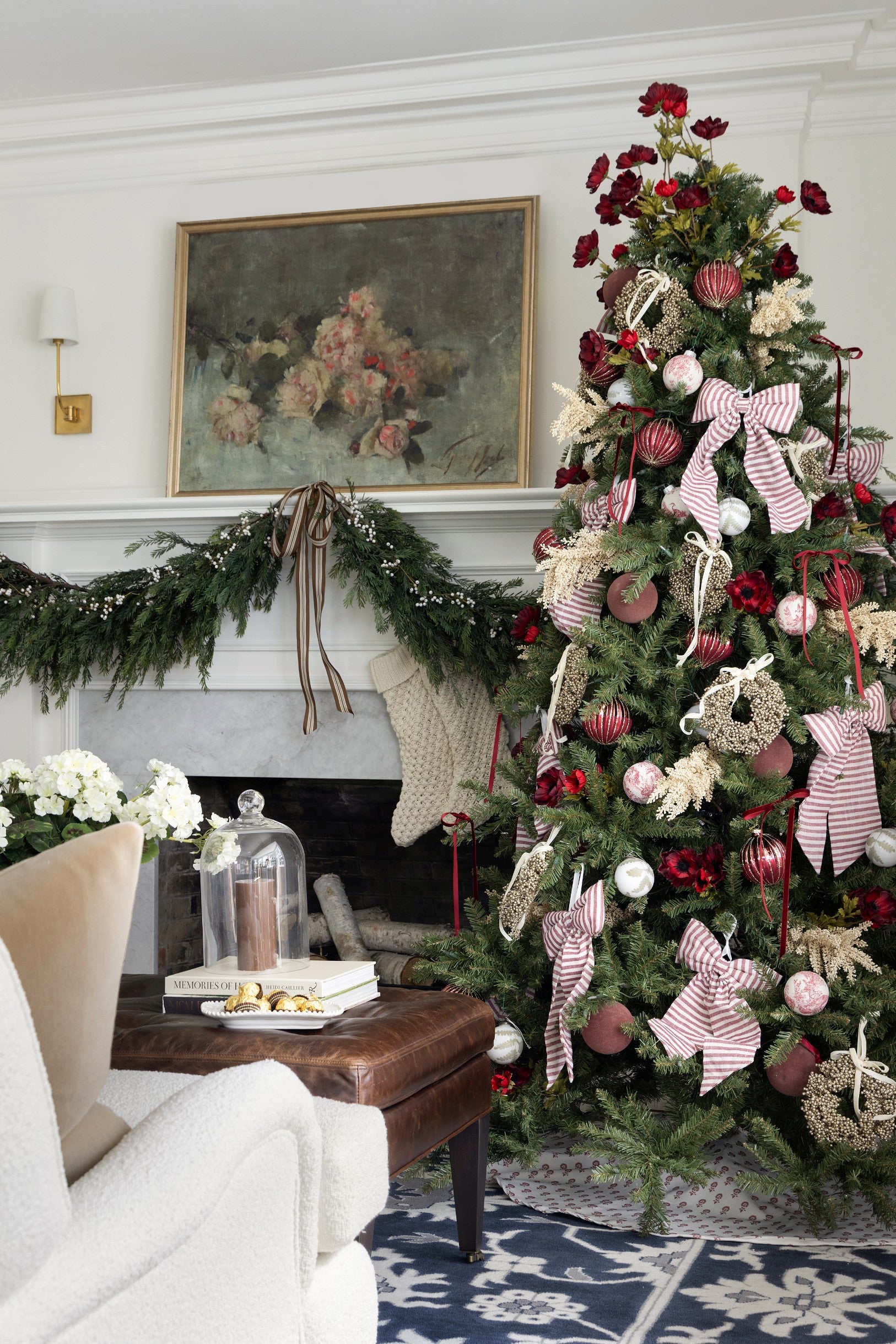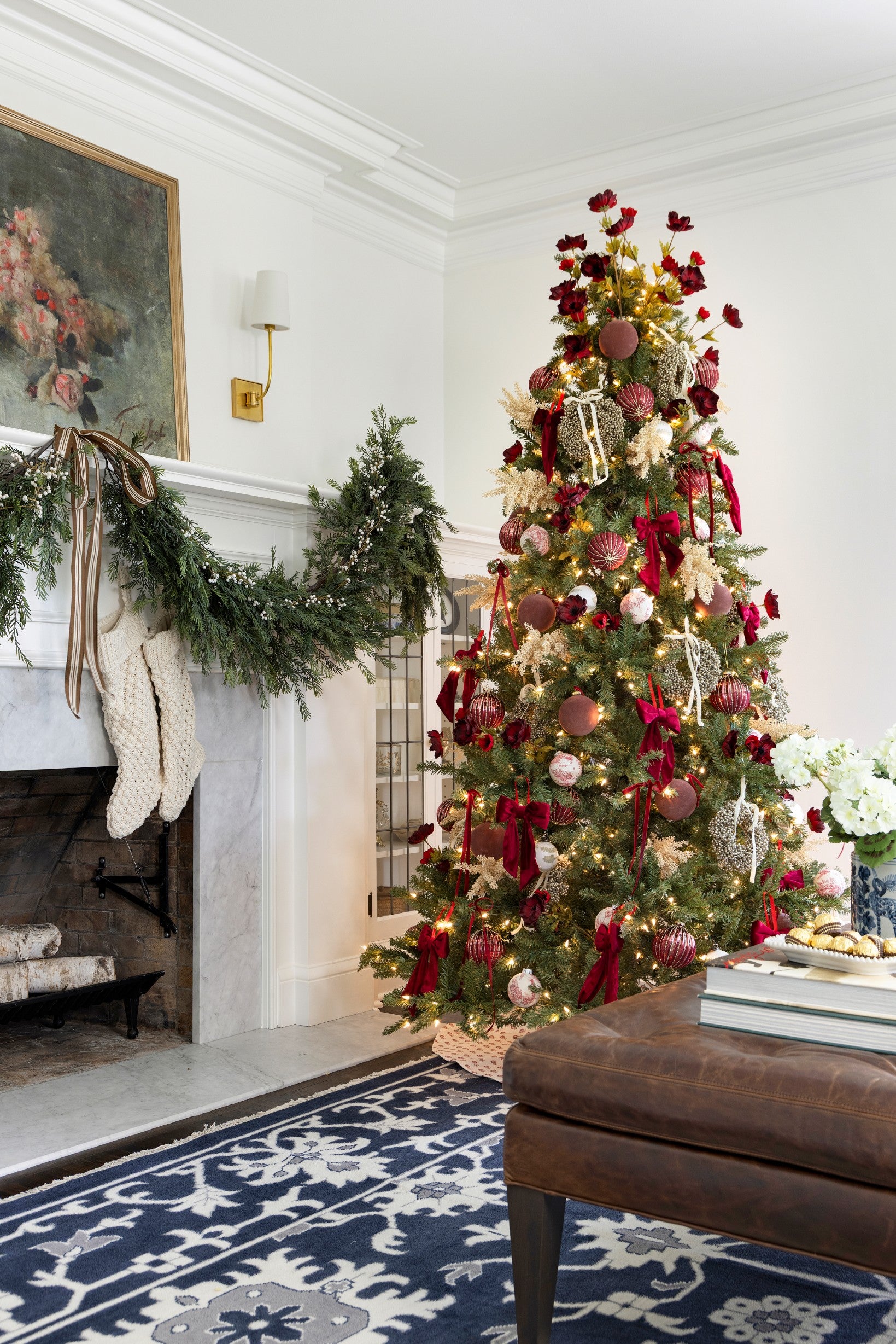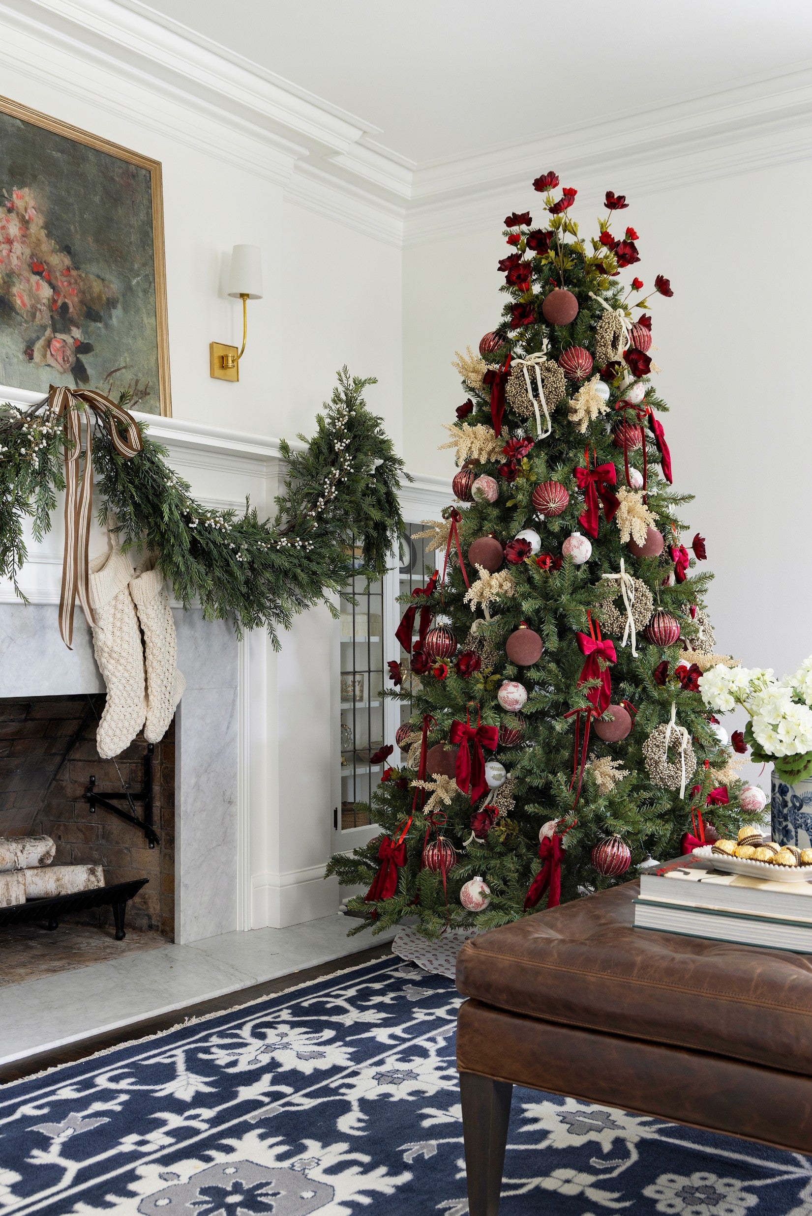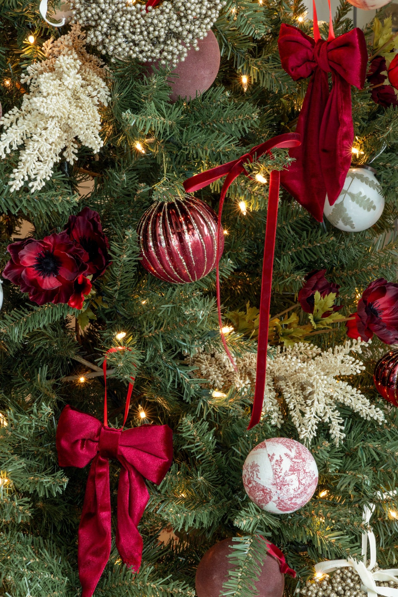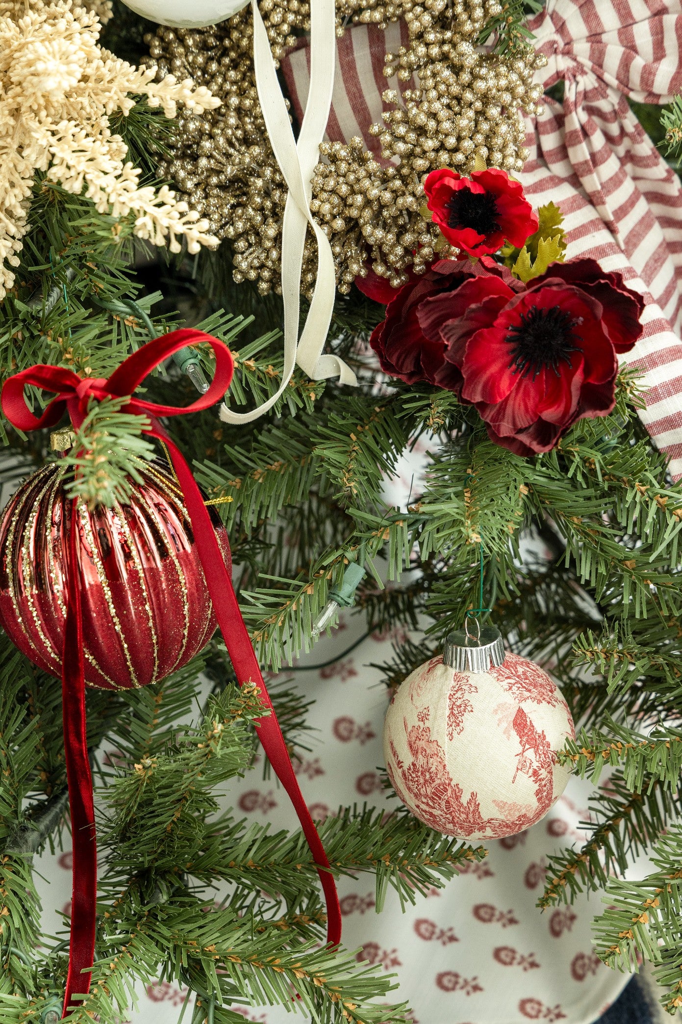 A beautifully layered Christmas moment blending classic red tones, textured florals, and heirloom-style ornaments - a fresh take on traditional holiday charm.