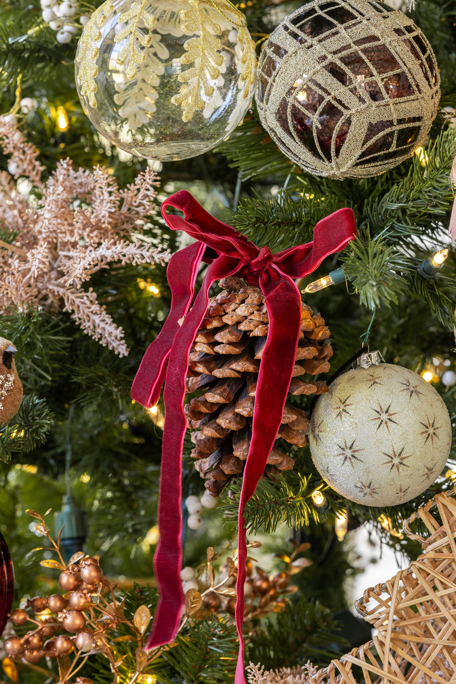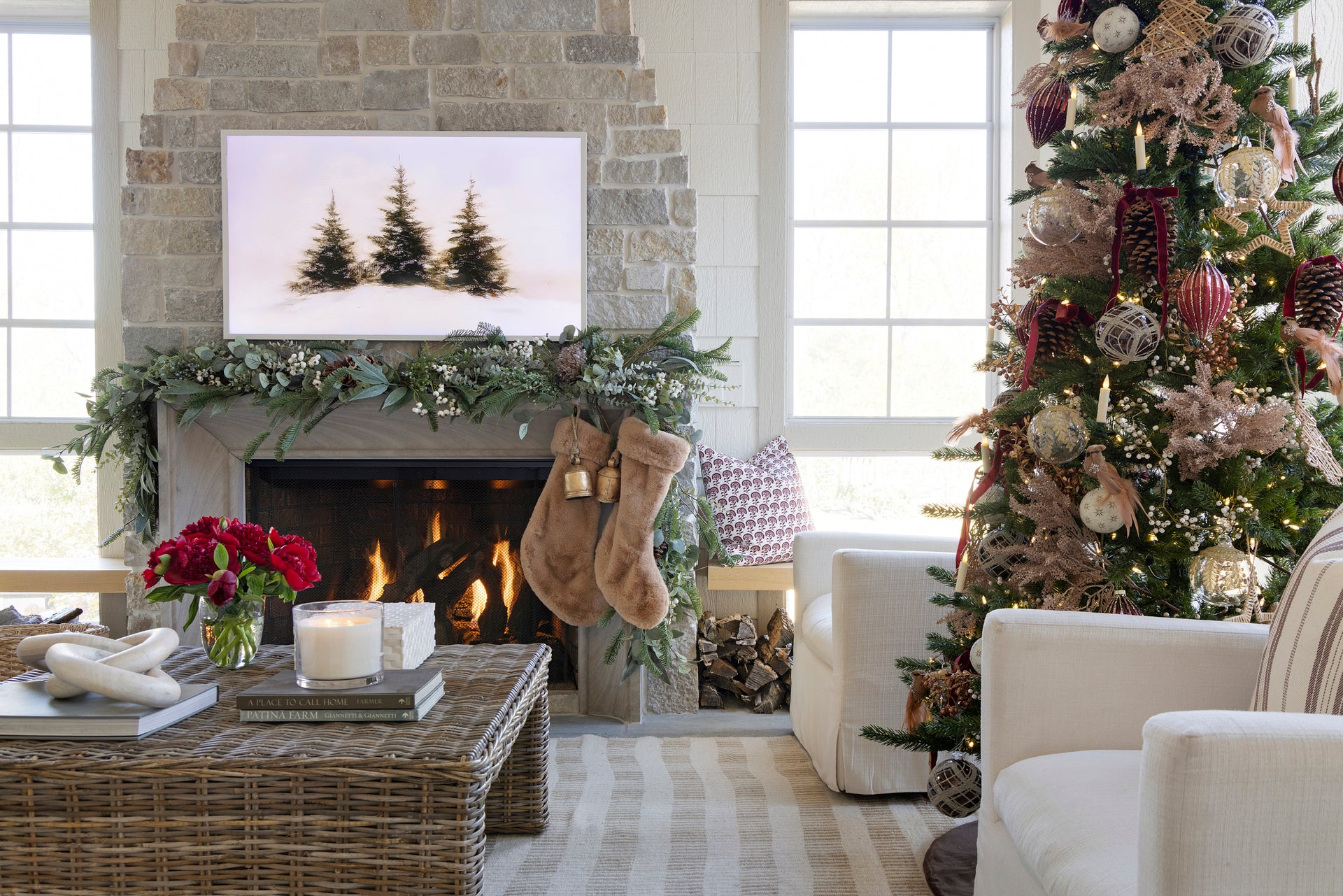 Warm textures, seasonal greenery, and the sparkle of the tree bring a relaxed, collected charm to this holiday living space.