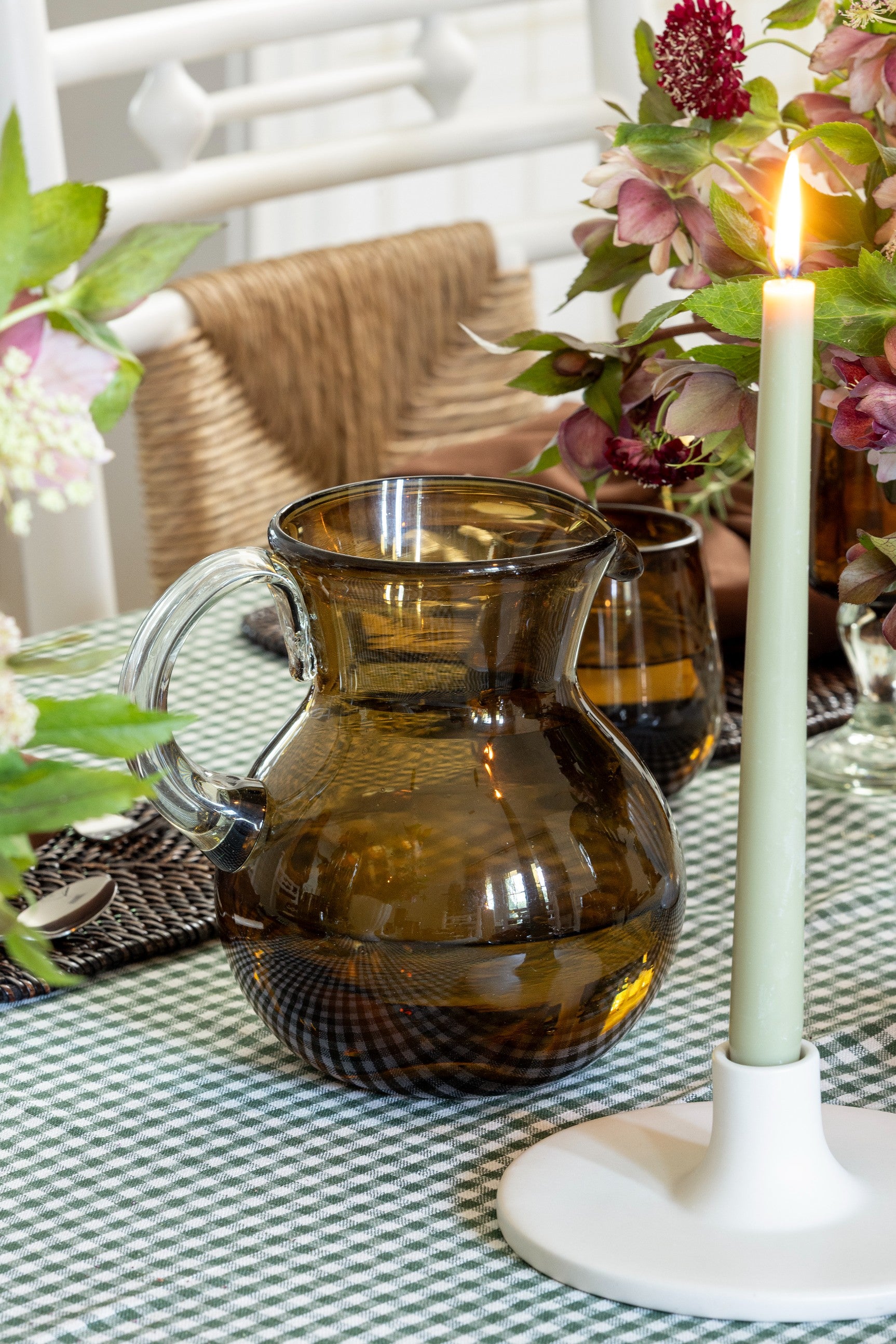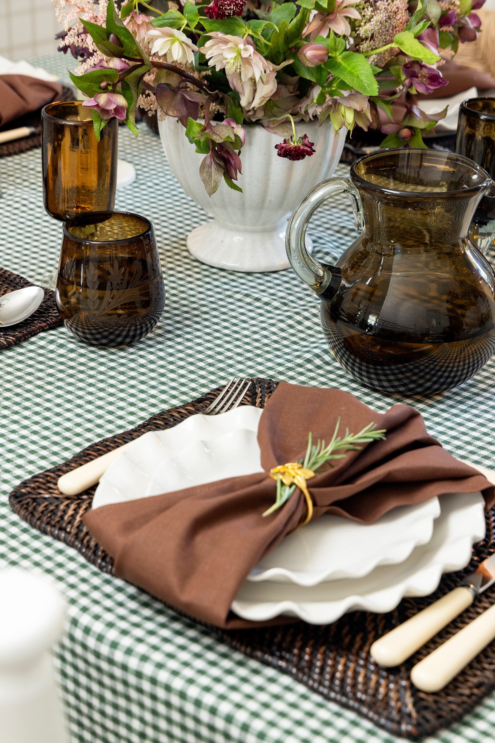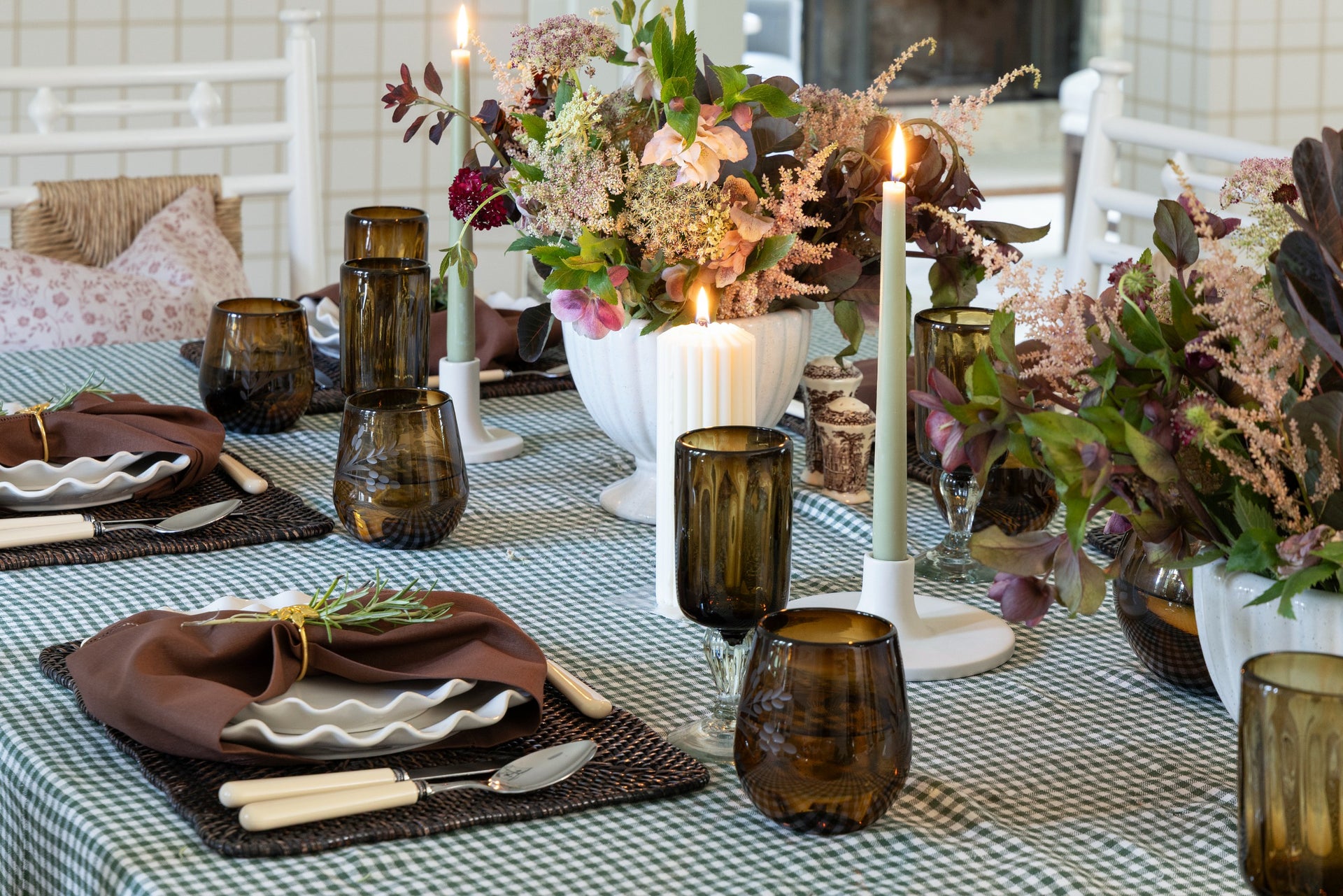 This fall tablescape layers warm amber glassware, woven textures, and soft florals with flickering candlelight - a timeless mix that feels bothy inviting and refined for the season's gatherings.