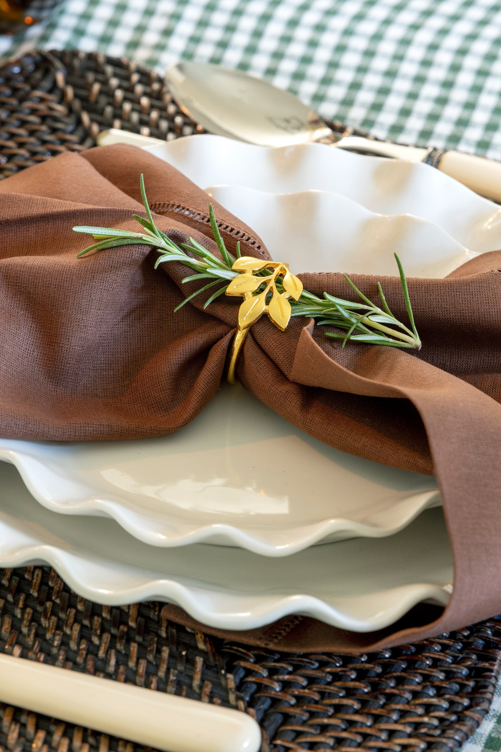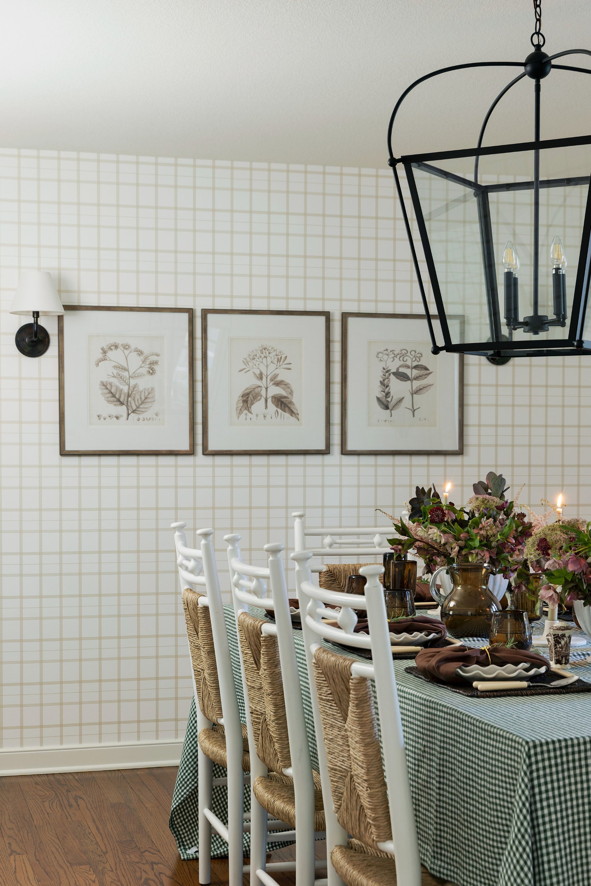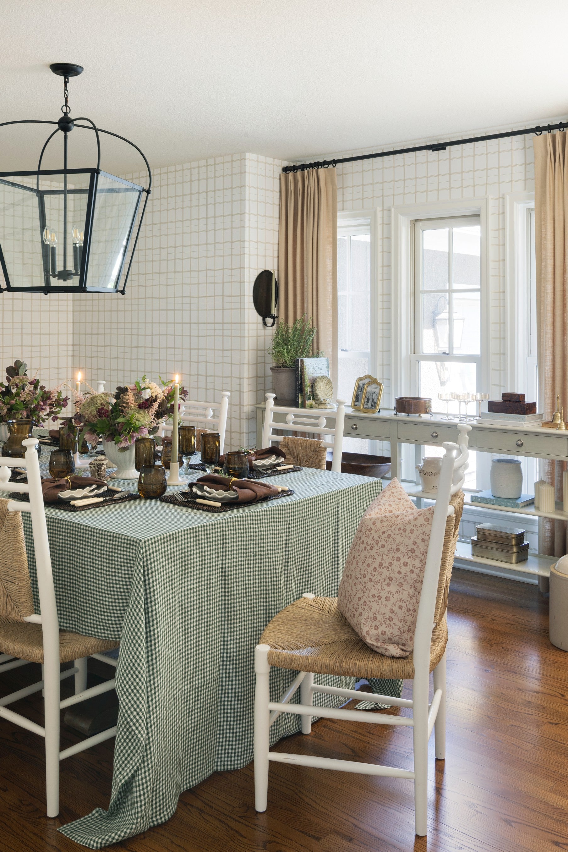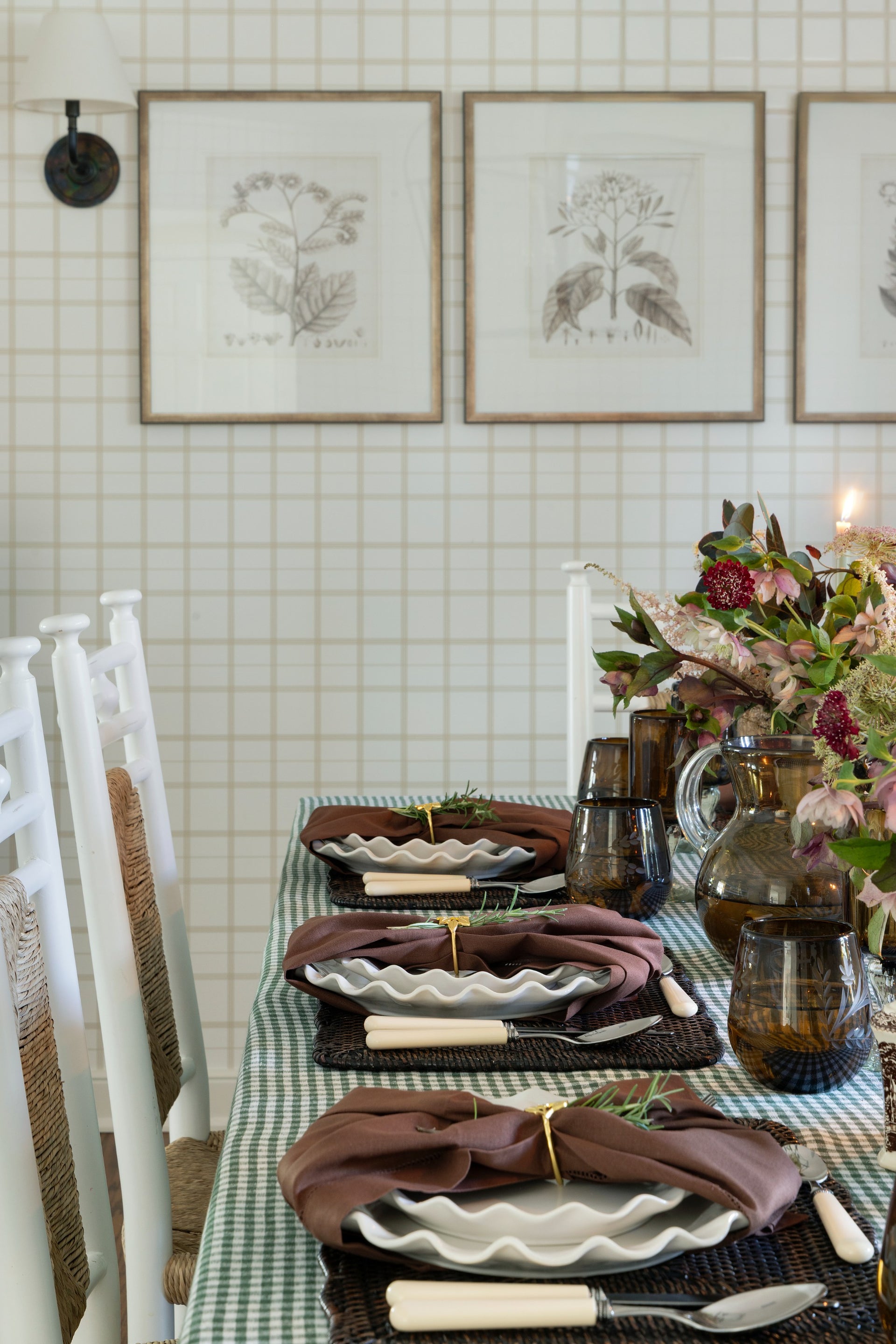 This fall tablescape layers warm amber glassware, woven textures, and soft florals with flickering candlelight - a timeless mix that feels bothy inviting and refined for the season's gatherings.