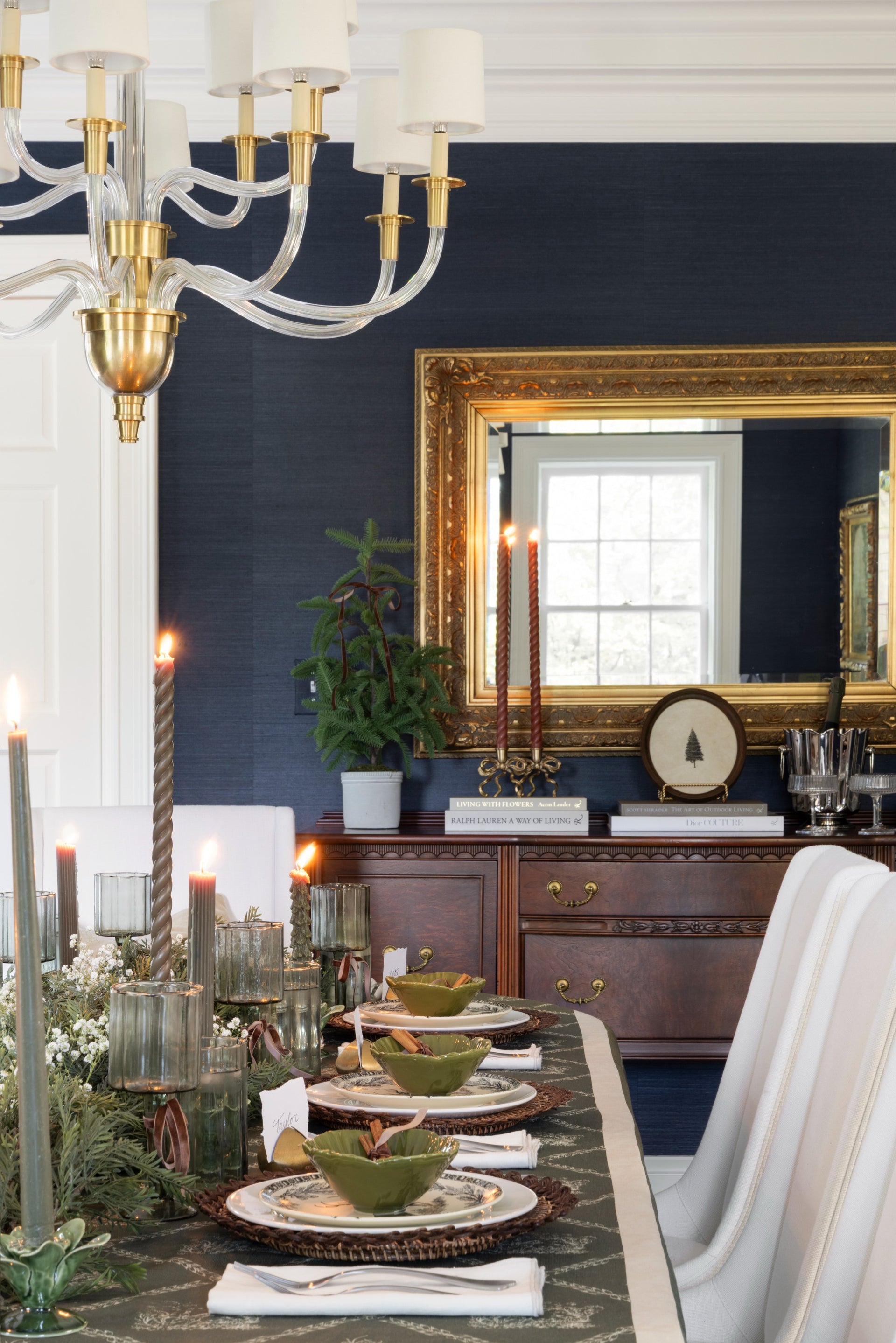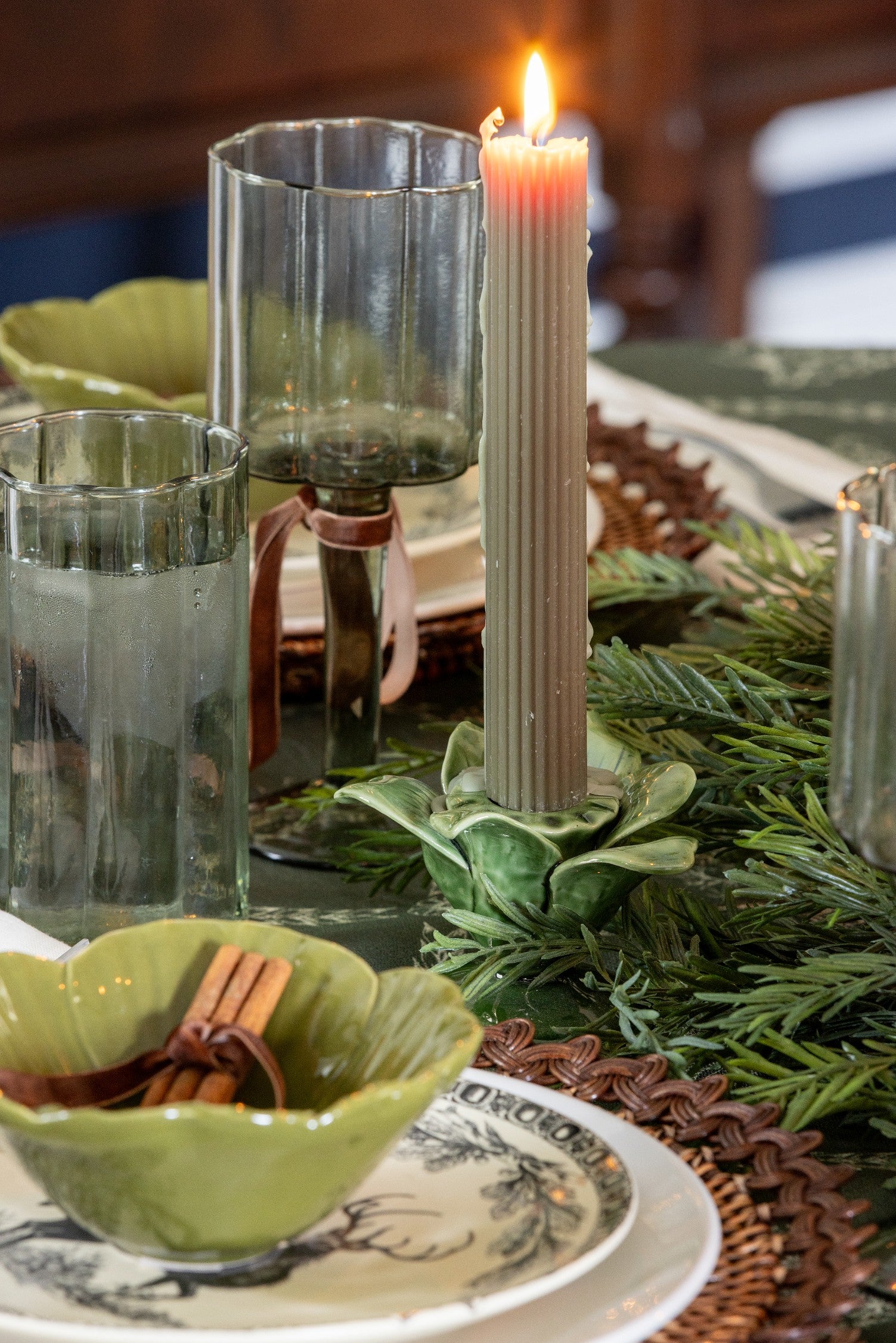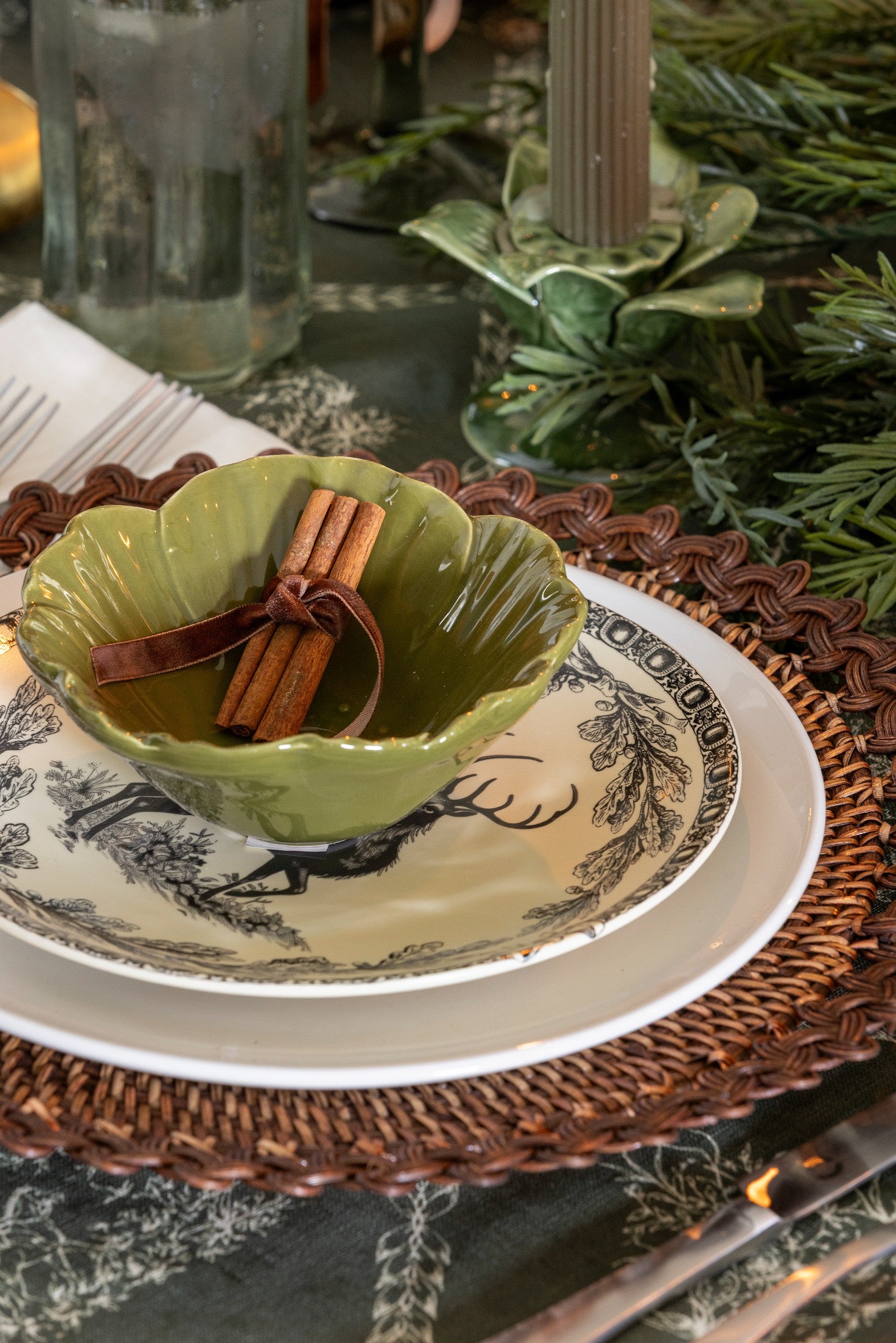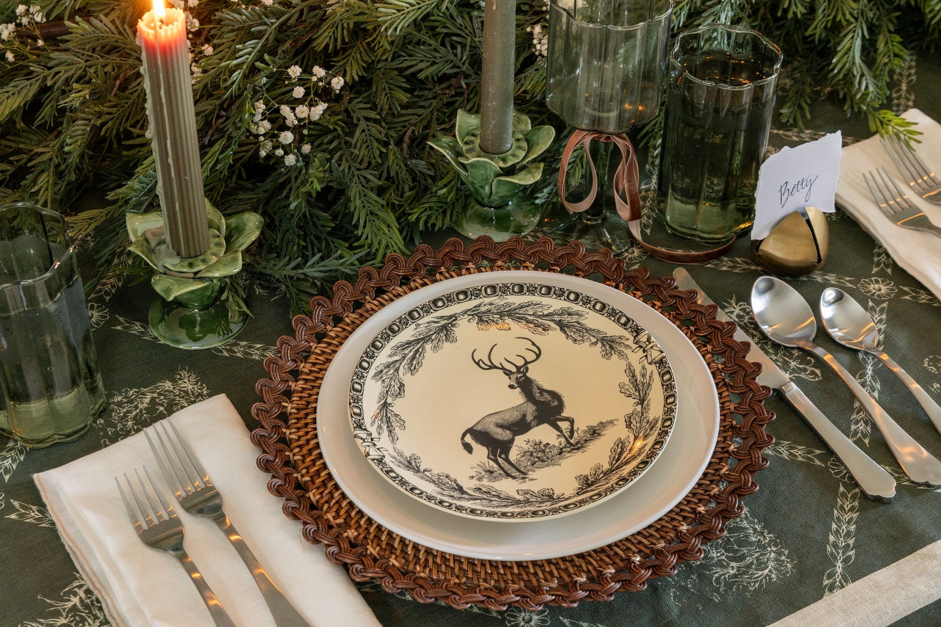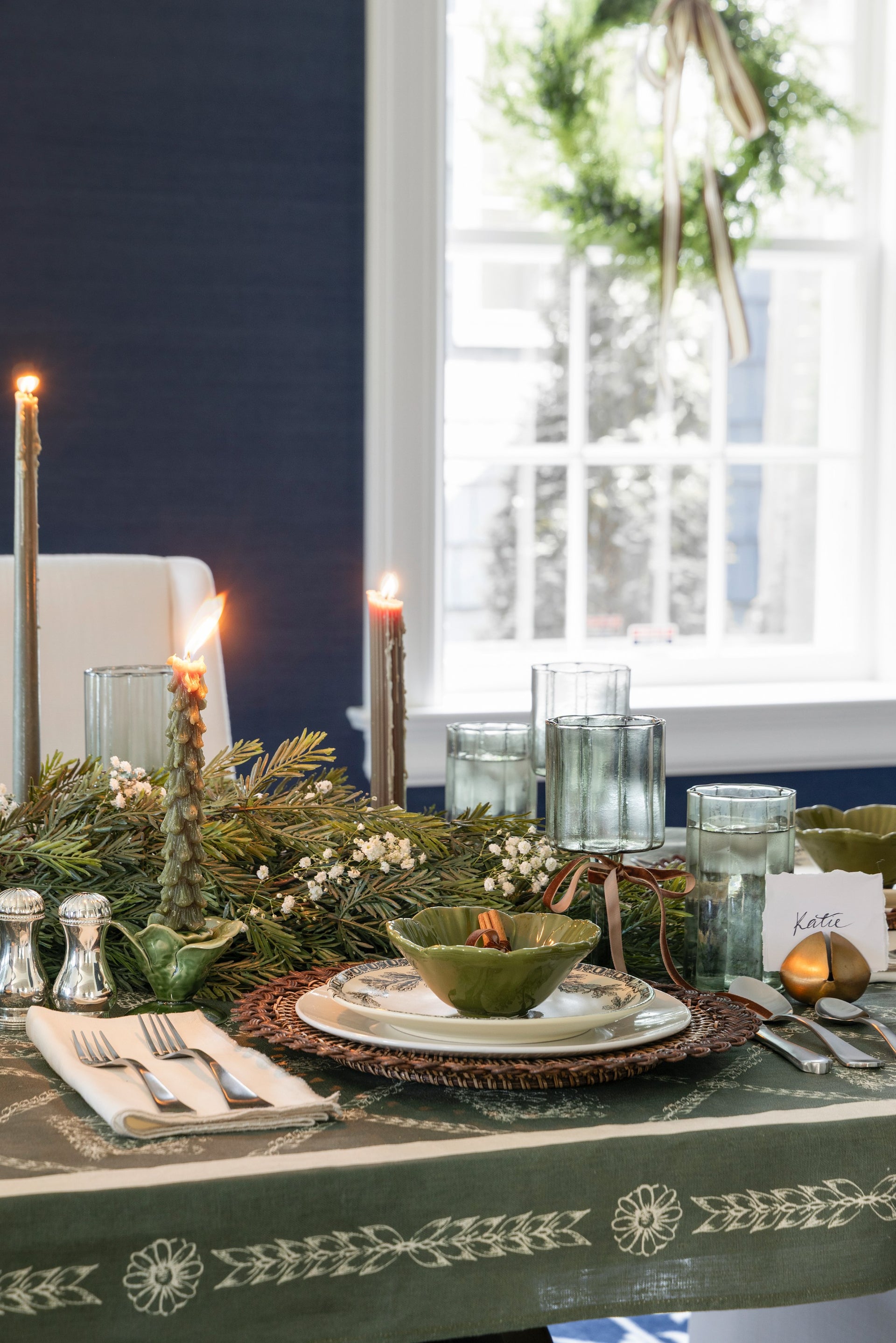 A thoughtfully designed holiday tablescape layered with greenery, candlelight, texture and personal touches that feel festive and timeless.