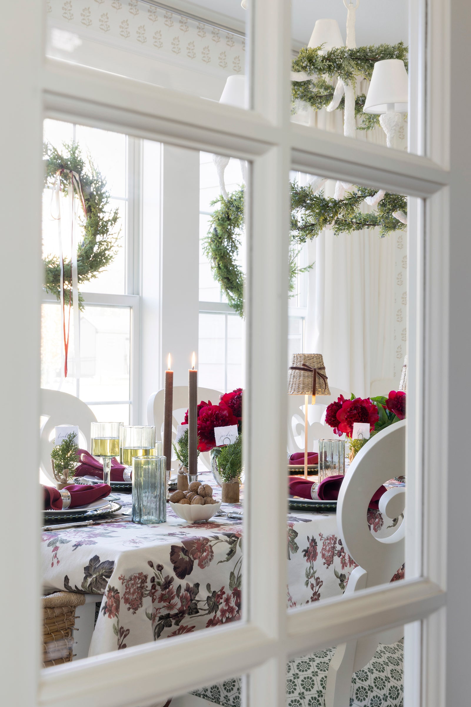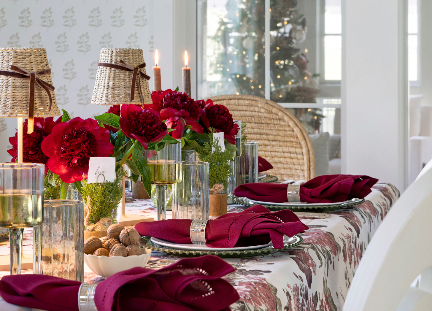 This table blends classic holiday tones - burgundy, red, and green - with floral prints, elegant soft lighting, and textured greenery.