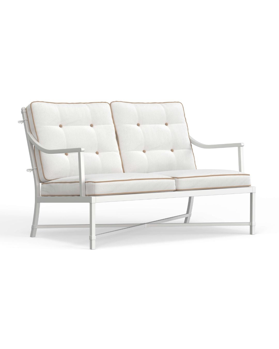 Say hello to the Riviera Love Seat - a blend of timeless elegance and outdoor durability. Crafted from aluminum and featuring a delicate scalloped back detail, this sofa exudes feminine charm and traditional style. Available in Sage and White, and adorned with a performance Sunbrella outdoor cushion, it offers both style and comfort. Whether on your porch, patio, or deck, the Riviera Love Seat provides the perfect spot for relaxation and outdoor gatherings.