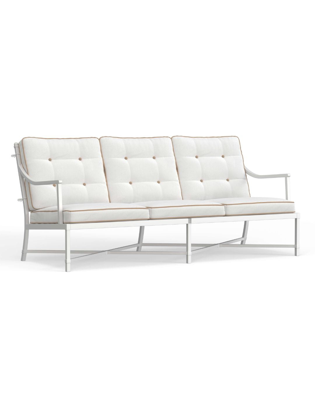 Introducing the Riviera Sofa - a blend of timeless elegance and outdoor durability. Crafted from aluminum and featuring a delicate scalloped back detail, this sofa exudes feminine charm and traditional allure. Available in Sage and White, and adorned with a performance Sunbrella outdoor cushion, it offers both style and comfort. Whether on your porch, patio, or deck, the Riviera Sofa provides the perfect spot for relaxation and outdoor gatherings.